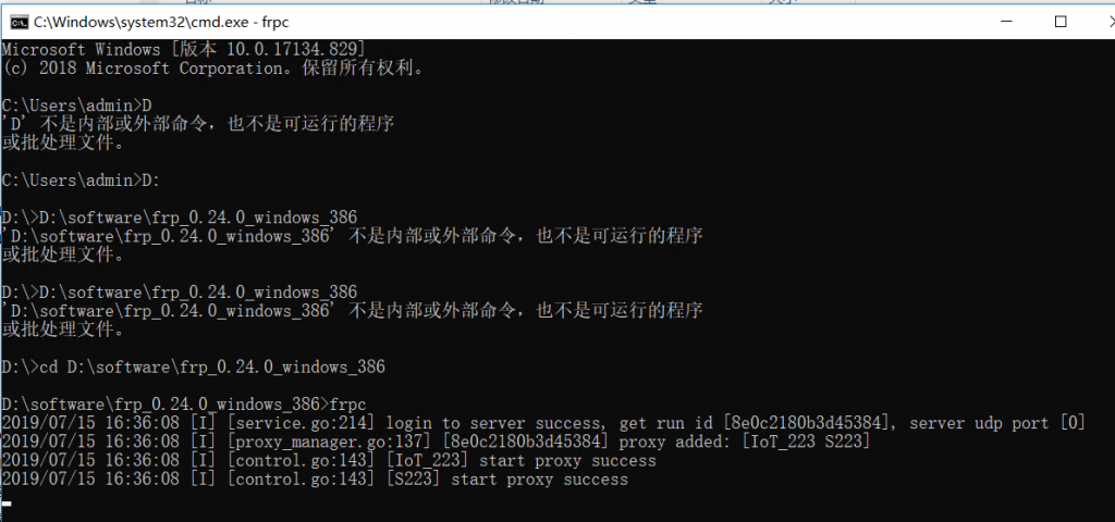 这样,客户端在frpc.exe文件夹中运行cmd,cmd中输入fprc即可。显示如下信息即表明运行成功: