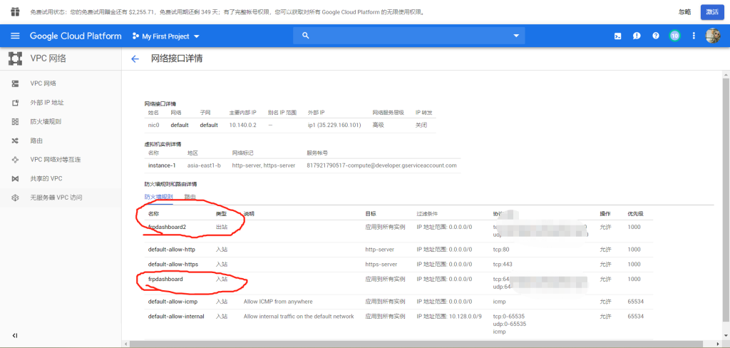 在将VPS送Linode迁徙到Google Cloud platform(GCP)上时,重新部署Frp,总是遇到配置完成之后无法访问 frp的dashboard ,经查证,是由于GCP实例主机的防火墙没有开发对应端口导致,GCP默认只开放几个常用端口,需要在GCP控制面板配置防火墙出入站规则。