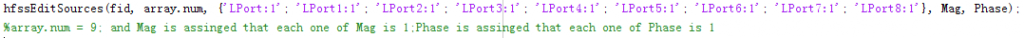 我是你的博客的一位读者,读到你的教程和资料之后,让我收获很多。 但作为刚刚设计天线仿真的一个新手,在我自己进行仿真时,遇到了问题,困扰了我几天仍然没有解决,想向你请教一下。 首先我基于较早版本的examples文件夹中的microwave_patch.m这个文件重新进行了设计,得到了一个9*1的线阵。由于我的目标是基于hfss和matlab,利用***算法调整阵元的激励,从而优化阵列方向图。因此需要对阵元激励进行调整,在读过你的教程之后,基于我的理解,我采用了hfssEditSources这个函数,格式如下: