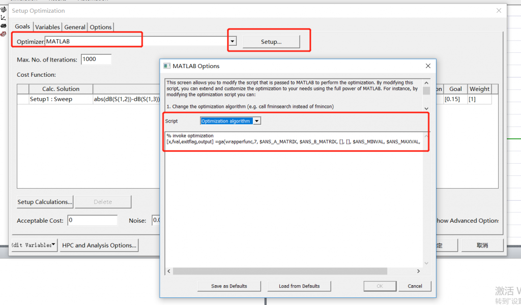 这里选择Optimizer为MATLAB,选择之后在右侧Setup中可以选择算法,需要注意的是优化参数的个数需要手动填入。注意看,在Optimizer下方有个Max No of Iterations,指的是优化最大迭代步数,默认1000。通常建议默认就行,优化开始后观察cost变化曲线,如果几百步内没有下降趋势,那么一般是由于优化变量或参数范围不合理导致,继续优化也没有意义了。