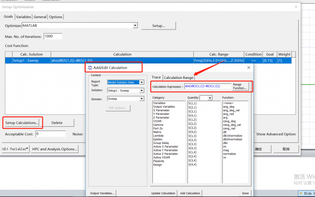 这里电桥的优化仅涉及到S参数,因此较为简单。优化目标(即Cost function)可以通过表达式,表示复杂的目标,根据项目实际自己摸索。
