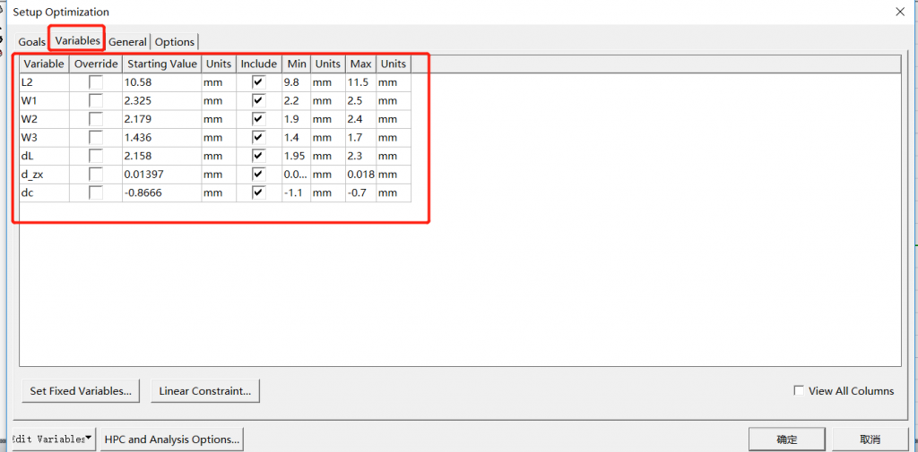 HFSS在使用优化工具箱之前,照例,依旧需要将设计到的尺寸用参数变量表示,并且需要在菜单中,将需要优化的参数勾选,才可以在Optimization选项卡中修改。