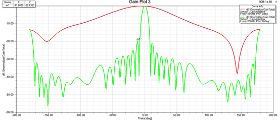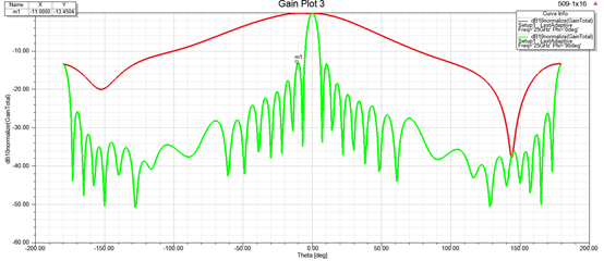 以1x16单元的微带阵列为例,在等幅均匀馈电的情况下,阵列方向图如下,副瓣电平为-13dB左右。